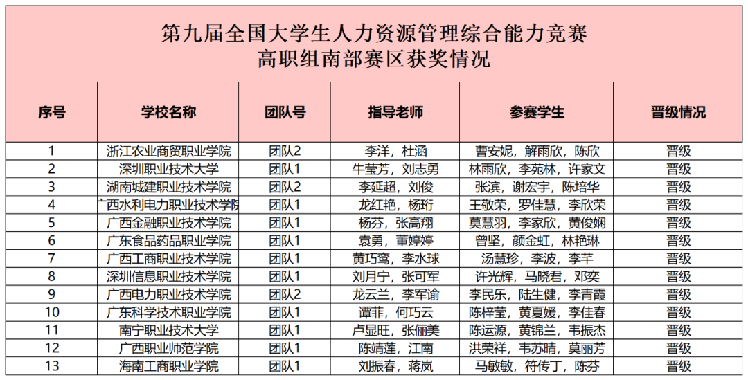下午13:25,在參賽選手和指導老師的焦急等待中,大賽組委會本著公平、公正、公開的原則,統(tǒng)計并核算各參賽團隊比賽成績,獲獎名單如下。至此,第九屆全國大學生人力資源管理綜合能力競賽(高職組)南部區(qū)域賽圓滿落下帷幕。