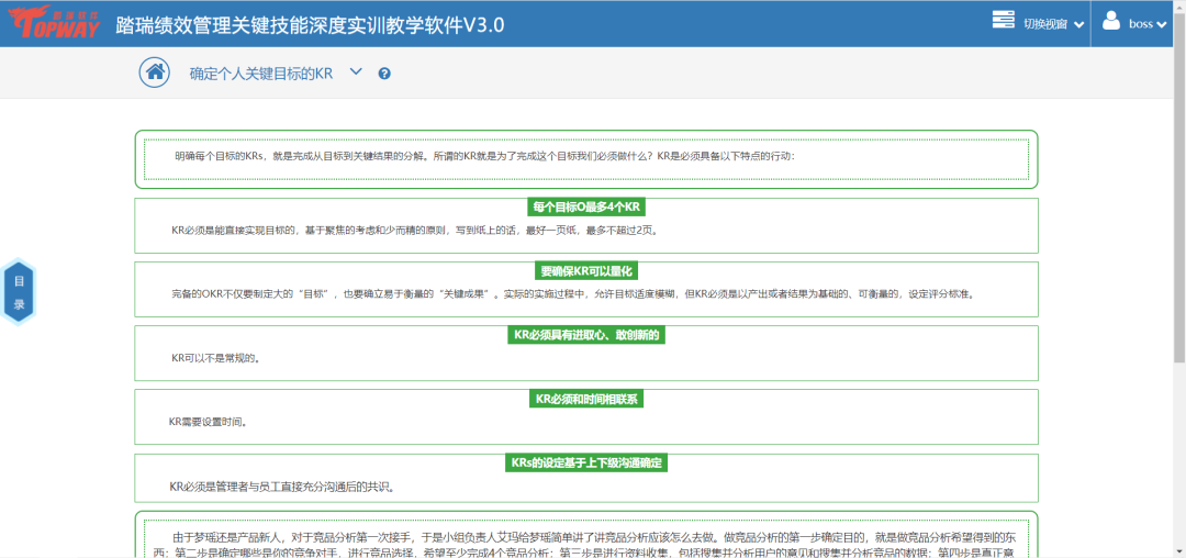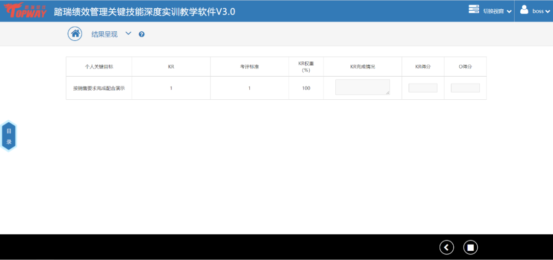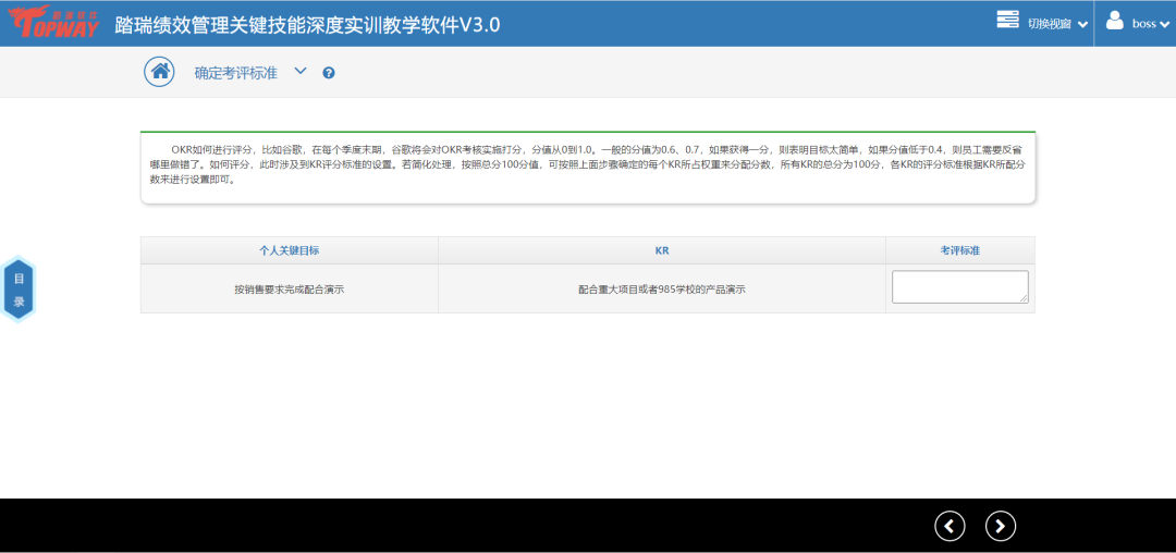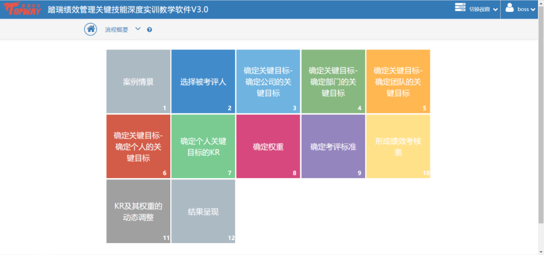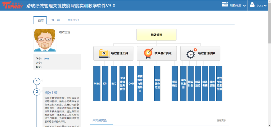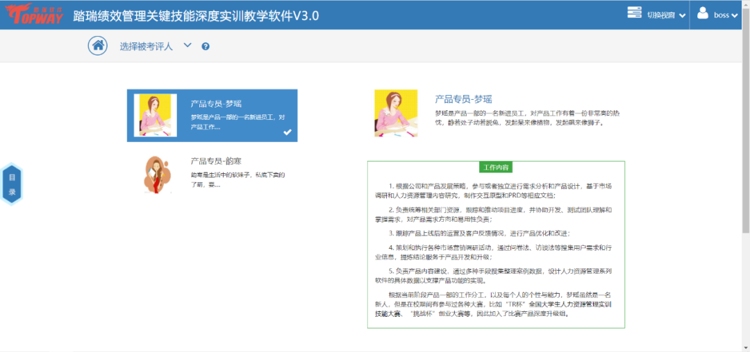 踏瑞績效管理智能反饋比賽軟件是一款緊密結(jié)合理論知識和工作實踐的績效管理課程實訓軟件。通過軟件,學生不僅能夠深度訓練常用的績效管理工具,還可以了解和練習新興的績效管理工具,例如OKR等。此外,學生還可以對績效設(shè)計要點進行充分訓練,對績效管理流程進行PDCA全過程綜合模擬。充分地將理論知識與績效管理工作的方法、工具和流程相融合。該軟件能夠充分發(fā)揮學生的主觀能動性,實現(xiàn)理論知識到工作實踐的高度轉(zhuǎn)化,切實達到績效管理課程“會設(shè)計”、“會執(zhí)行”的教學目的。