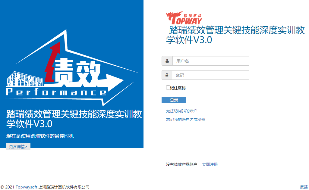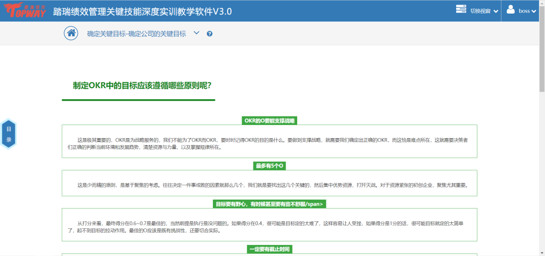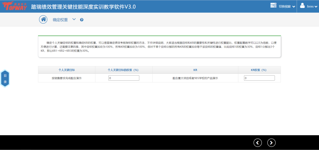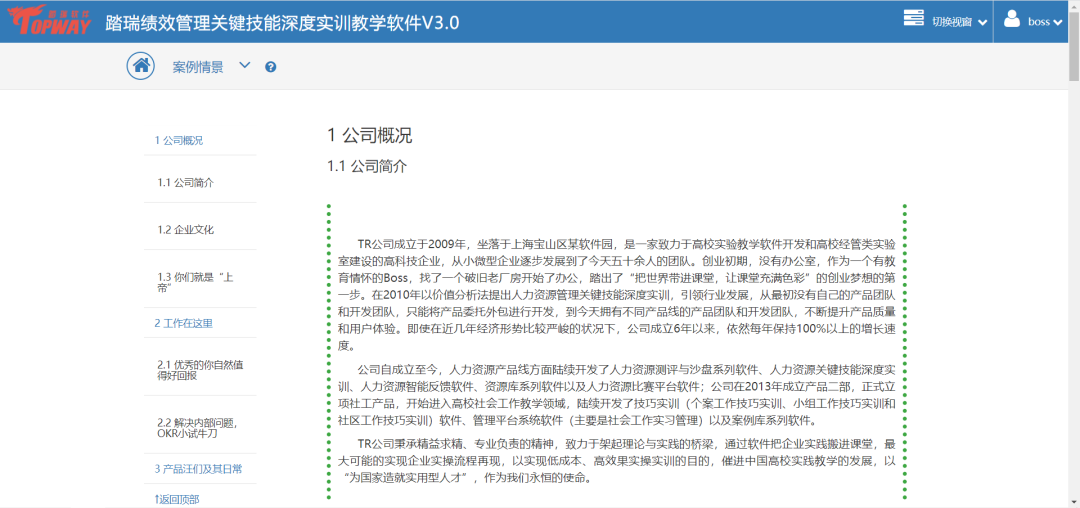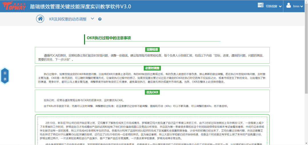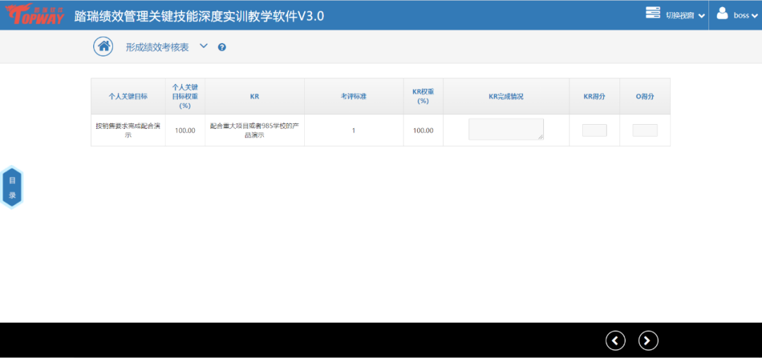 踏瑞績效管理智能反饋比賽軟件是一款緊密結(jié)合理論知識和工作實踐的績效管理課程實訓軟件。通過軟件,學生不僅能夠深度訓練常用的績效管理工具,還可以了解和練習新興的績效管理工具,例如OKR等。此外,學生還可以對績效設(shè)計要點進行充分訓練,對績效管理流程進行PDCA全過程綜合模擬。充分地將理論知識與績效管理工作的方法、工具和流程相融合。該軟件能夠充分發(fā)揮學生的主觀能動性,實現(xiàn)理論知識到工作實踐的高度轉(zhuǎn)化,切實達到績效管理課程“會設(shè)計”、“會執(zhí)行”的教學目的。