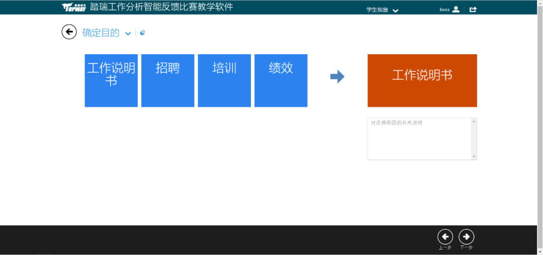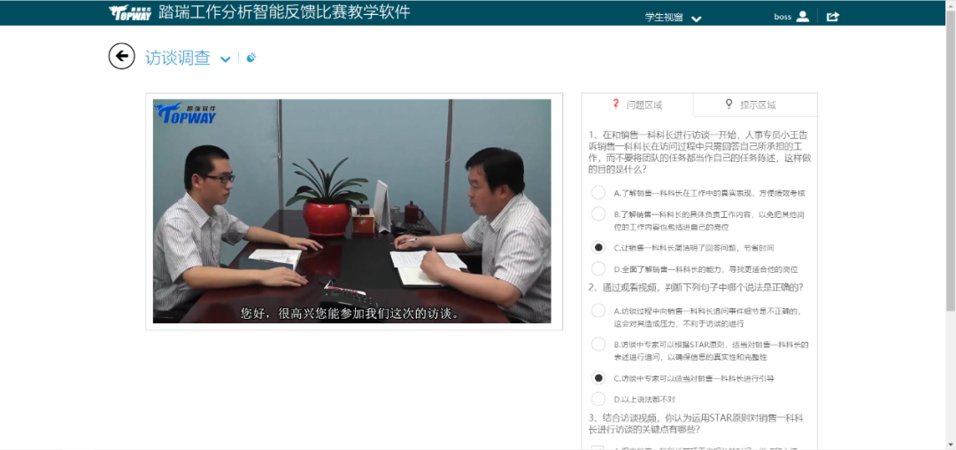 踏瑞工作分析智能反饋比賽教學軟件,包括工作分析的一般過程、問卷法、任務清單法、關鍵事件法、勝任力素質模型和工作說明書編制等內容。在每一具體的實驗流程中,軟件時刻秉承“所見即所得”的指導思想,在具體內容上積極探索情景模擬再現和多樣化的參與方式,在視頻、選擇和問答等傳統形式的基礎上探索了使用拖曳、flash和判斷等的新形式。