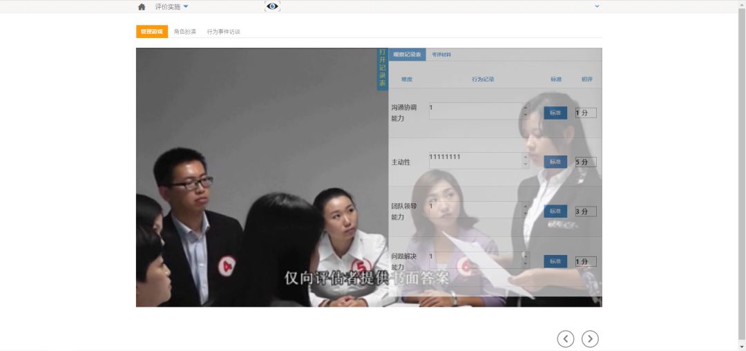 軟件將全景化案例作為核心內容,以某一評價技術為主線,在給定的不同案例背景(即實訓場景)中,學生需嚴格按照該評價技術的實戰操作流程進行線上體驗。在此過程中,學生需觀看企業招聘視頻,并擔當評委,對視頻中候選人進行行為記錄與打分。系統將著重引導學生在候選人互動與及時反饋環節中進行細致觀察,并提供行為記錄范本、維度評價標準、參考答案及在線討論等功能模塊。軟件系統通過對甄選技術的縱向挖掘,幫助學生扎實掌握招聘技術精髓。通過每一階段流程圍繞案例的實戰演練讓學生掌握招聘與甄選的實施方法。