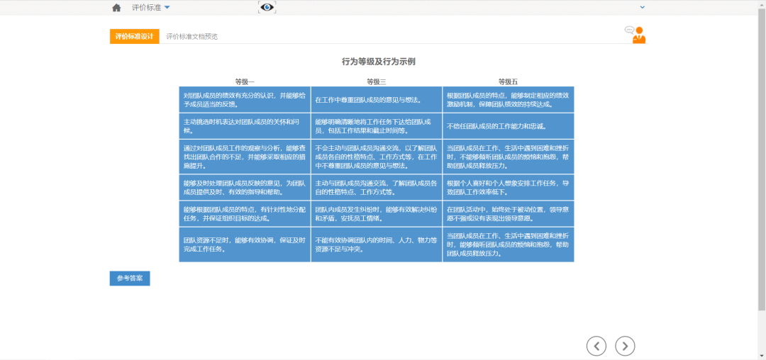 通過對某評價維度的不同行為表現劃分等級,配合標準化的參考答案,讓學生切實了解到如何針對不同評價維度設計評價標準。